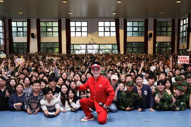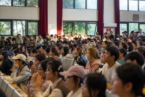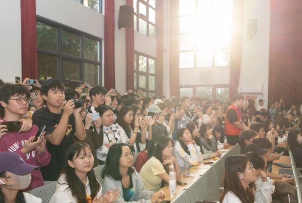 为了满足同学们的合影要求,章老师走到舞台前,蹲下身子,与现场全体同学一起合影。随着潮水般汹涌的欢呼声,摄影师将章老师亲切和蔼的笑容,与同学们脸上洋溢的喜悦与激动,定格成了永恒的瞬间。合影结束后,章老师站起身来,向同学们挥手致意,感谢他们的支持。同学们以雷鸣般的掌声和欢呼声向章老师致以最崇高的敬意和感谢。
