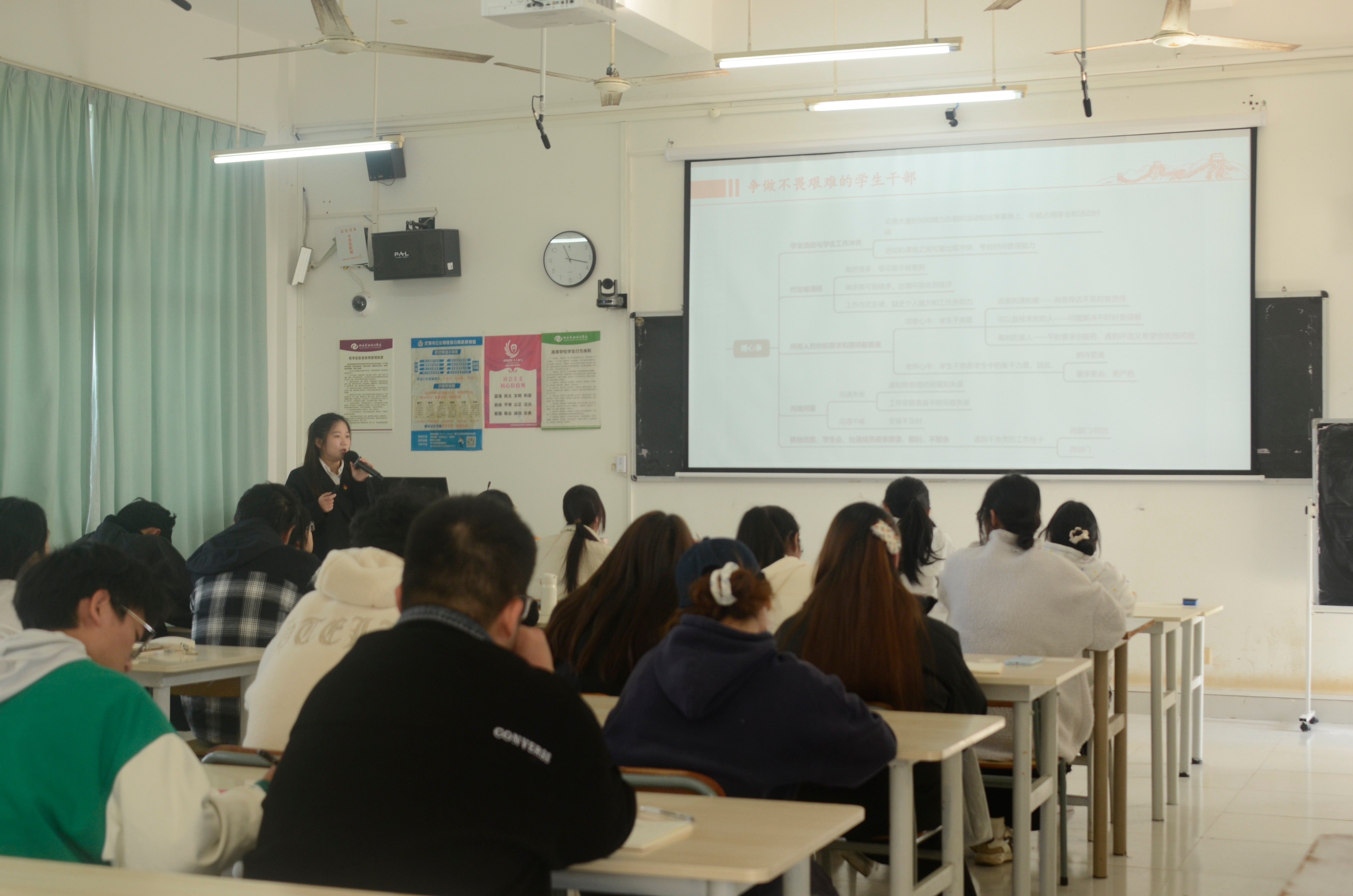 教育学院党支部书记黄思敏以“争当新时代有担当的学生干部”为题,强调学生干部应从学生中来,到学生中去,更好地服务学生,勇于承担。以高远的理想为指引,坚定的信念作支撑,真正做到立身正、行事端,时刻保持光明磊落的胸怀,推动社会向着更加美好的方向大步迈进。