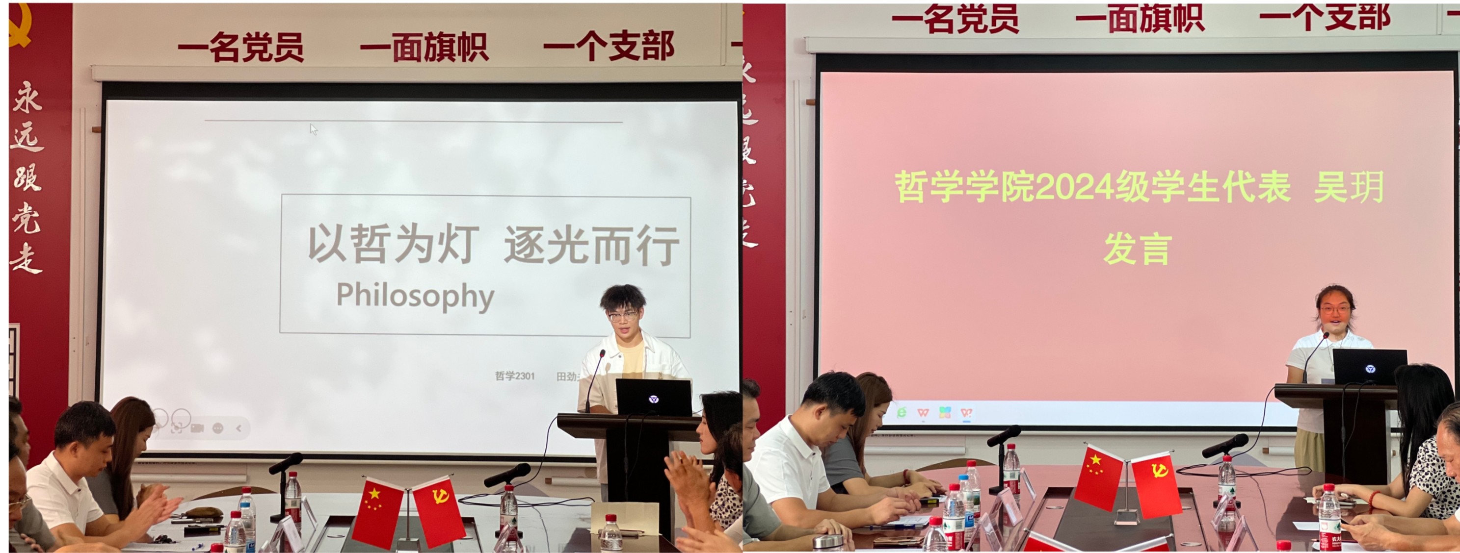 会议第三项议程,学生代表发言。哲学专业2023级田劲夫同学和2024级吴玥同学作为老生代表发言。他们分享了自己的校园经历和学习收获,号召大家充分利用学校优质的学习资源,积极参与学校丰富的校园拓展活动,努力锤炼本领,在哲学这片沃土中深耕不辍,勇敢前行。