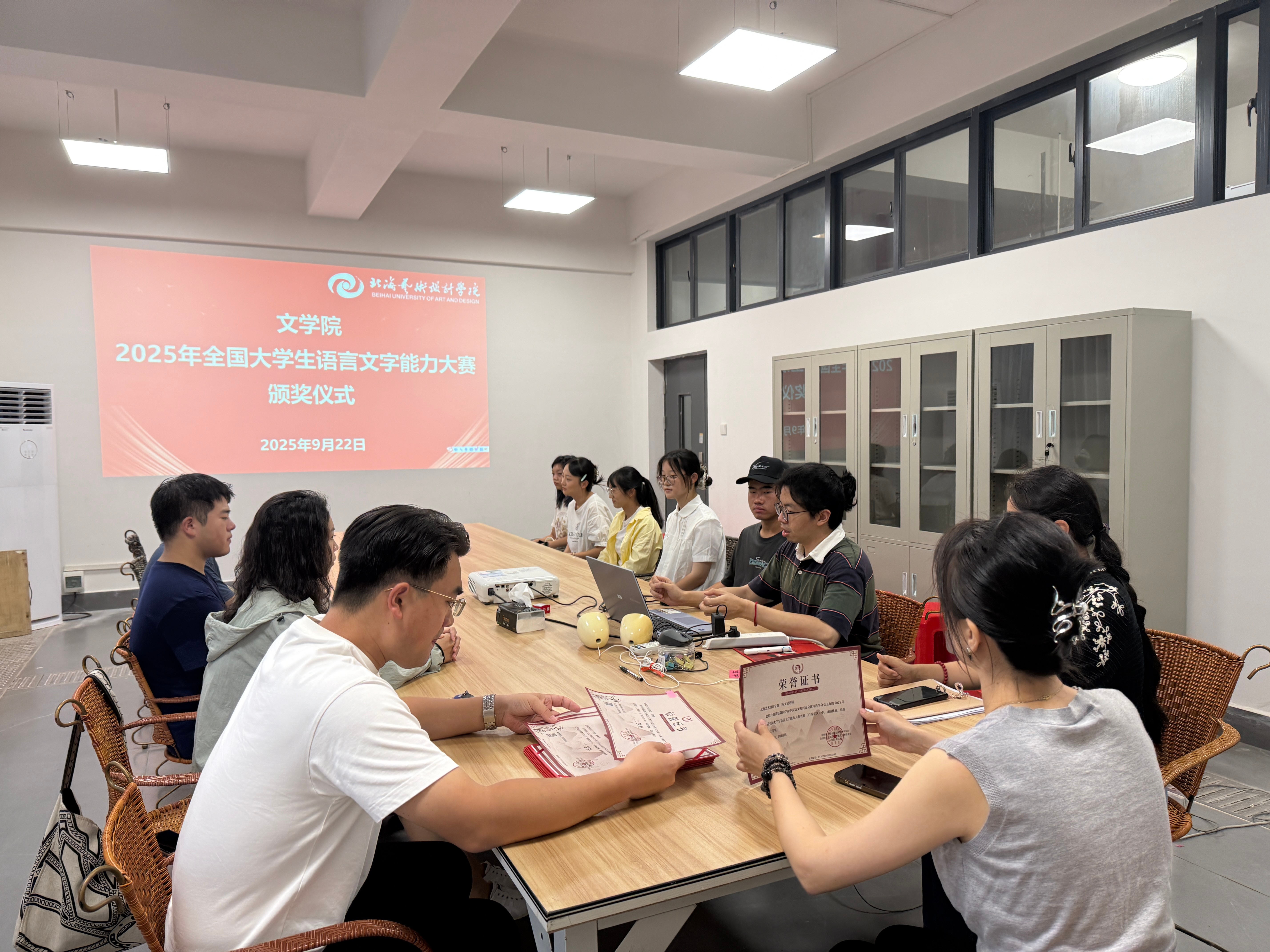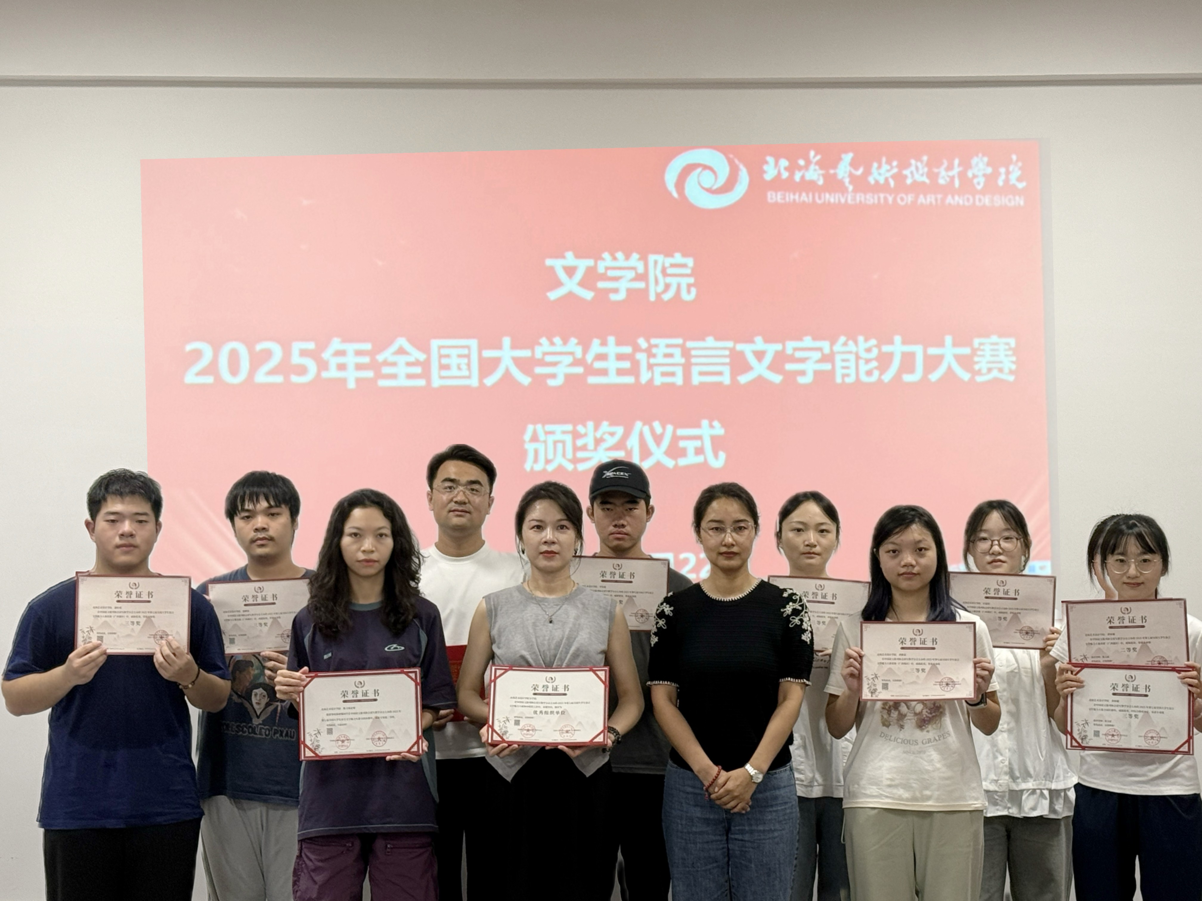颁奖仪式上,学院领导为获奖师生颁发证书并表示祝贺。本次大赛文学院学子表现突出,共获得专业组奖项13项。其中,黄妍馨同学荣获全国决赛三等奖,涂煜昊同学获得广西赛区一等奖,黄妍馨等2名同学获得广西赛区二等奖,卢群等9名同学获广西赛区三等奖。陈文斌等3名教师获“优秀指导教师”称号。这些奖项不仅体现了学子们扎实的语言文字功底,也展现了文学院教师人才培养的显著成效。此外,文学院凭借出色的赛事组织工作,被大赛组委会授予“优秀组织单位”荣誉称号。
