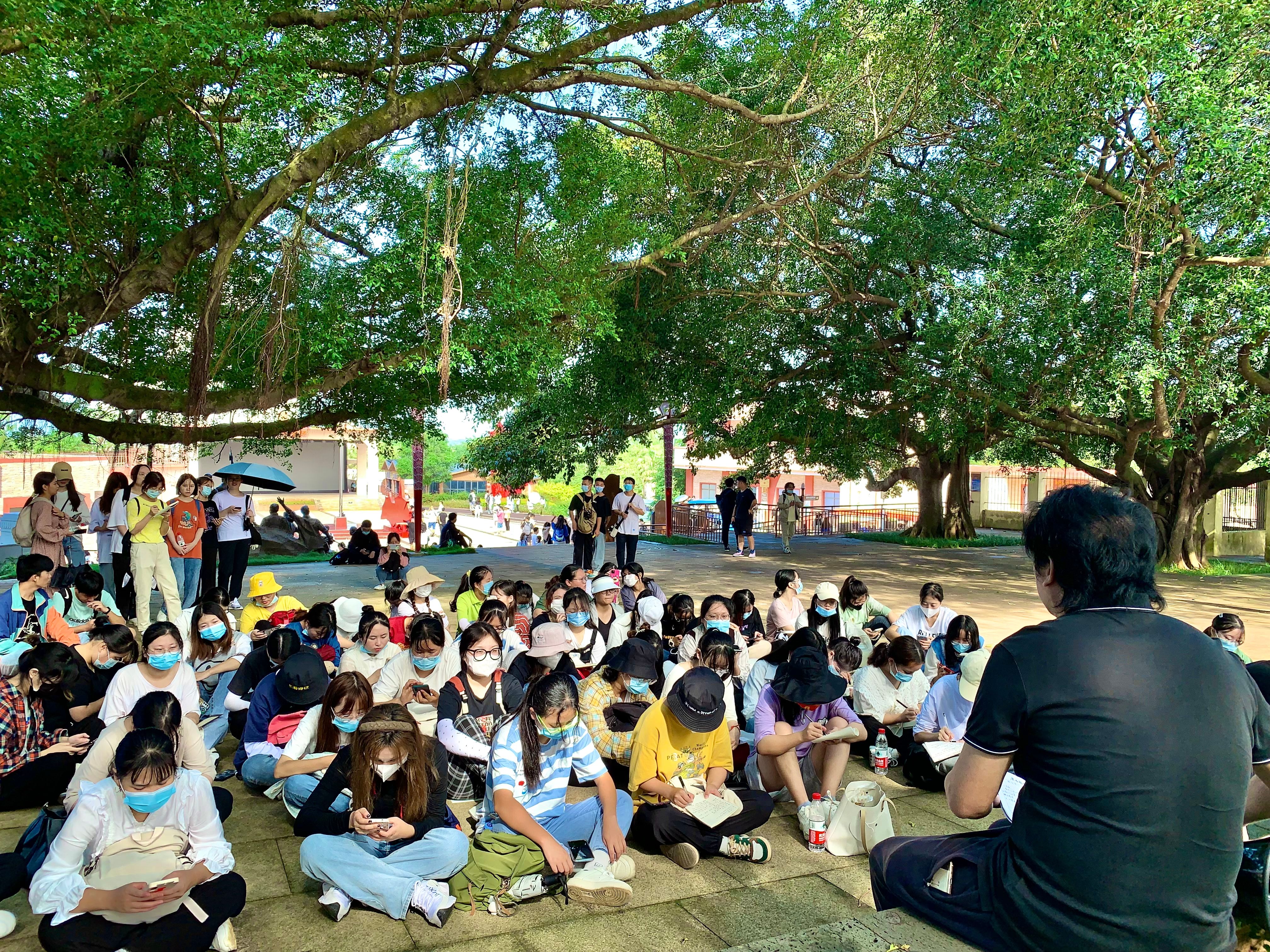 在烈士革命纪念碑旁边的大榕树下,我院陈敢教授为汉语言文学专业的同学做了题为《散文写作浅谈》的专题讲座。陈教授从散文定义、散文类型、散文题材、散文表现对象、散文的写作要点、一篇优秀散文的写作要求等方面对散文写作做了深入浅出的讲解。陈教授认为一篇好的散文首先应满足以下要求:情感真挚、选材合理、语言晓畅、蕴含深度哲理、透视人性的复杂性、反映生活的真谛。同学们仰望着烈士纪念碑,聆听着陈教授的讲座,在微风不躁、秋光明媚的红色广场忆先辈舍生忘死之义,悟文学创作之道。
