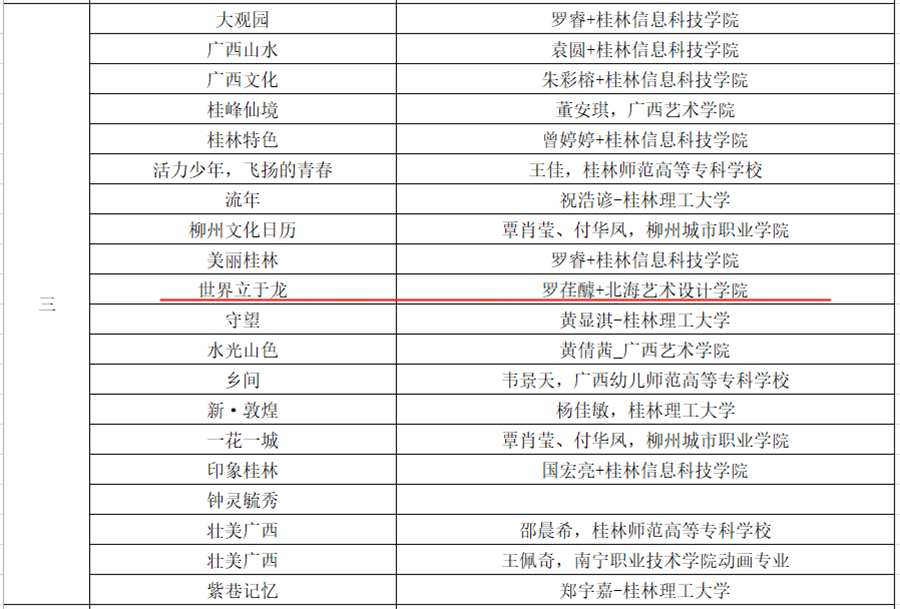 近日,由广西壮族自治区文化和旅游厅、自治区教育厅、自治区科学技术厅、自治区农业农村厅、自治区商务厅、自治区国资委主办,广西广文创意数字科技有限公司承办的“漫绘广西,秀展八桂” 2022广西金桂国漫大赛公示了获奖名单。我校动画与传媒学院共获奖11项,其中场景类二等奖3项、三等奖1项、优秀奖1项;动漫角色设计类二等奖1项、三等奖1项;广西特色文化类三等奖1项、优秀奖3项;孙永辉、 虞德强、李宗毅、吴锡红等老师荣获优秀指导教师奖;动画与传媒学院获优秀组织奖。