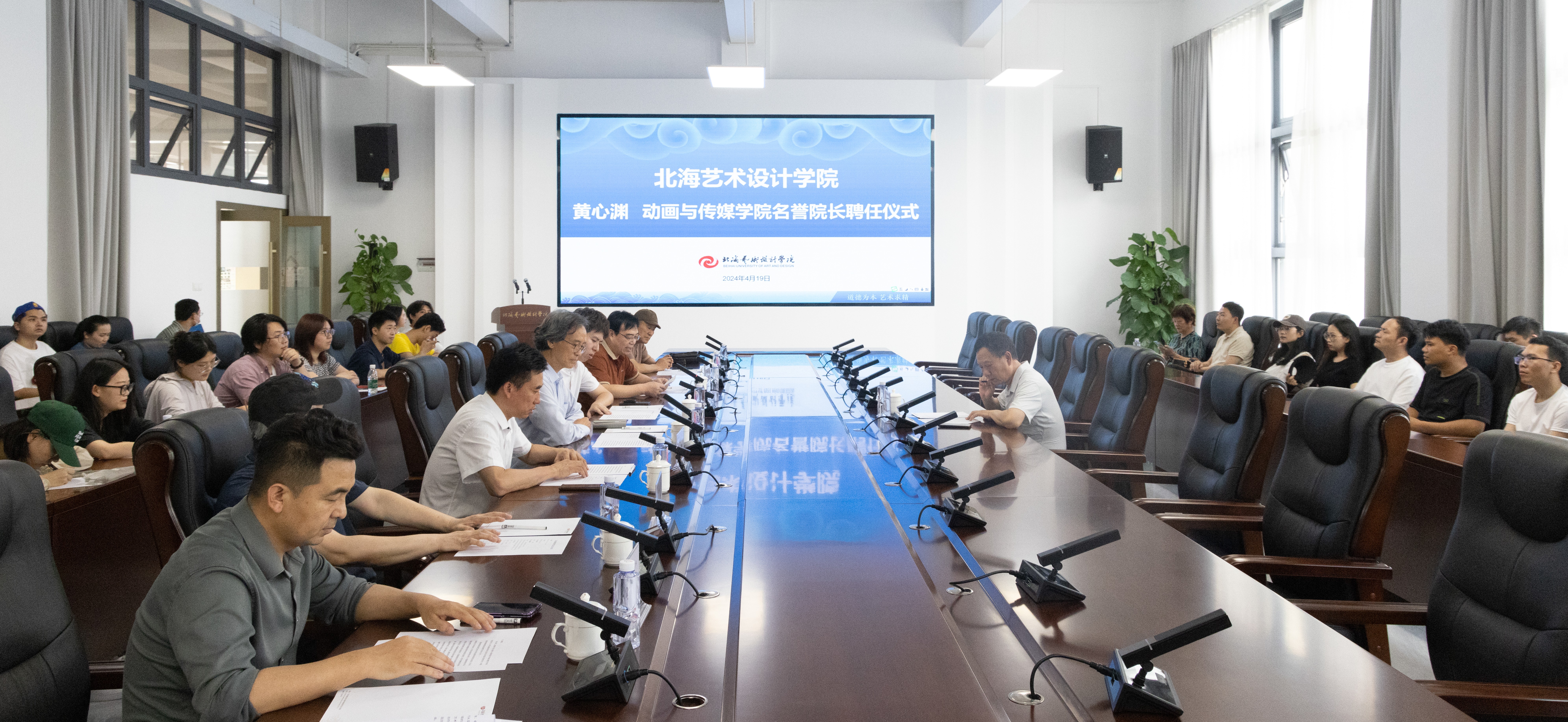 4月19日,我校聘请中国传媒大学动画与数字艺术学院党委书记,数字动画技术研究与应用北京市重点实验室主任,动画与数字媒体国家级实验教学示范中心主任黄心渊教授为动画与传媒学院名誉院长,聘任仪式在我校南校区艺德楼8楼会议室举行。校长卢新华,董事长郑念贻,副校长陶立阳,副校长包建明,动画与传媒学院院长孙永辉,学院领导,王钢教授,高亮教授,部门负责人,学院专业教师参加仪式。仪式由副校长包建明主持。