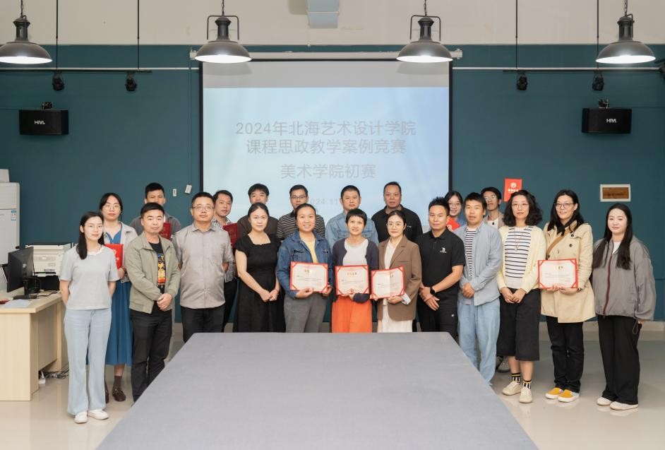 为全面贯彻党的二十大精神,深入落实立德树人根本任务,继续加强学院课程思政建设,提升教师课程思政教学能力,不断探索和创新课程思政教育教学方法,2024年北海艺术设计学院课程思政教学案例竞赛美术学院初赛于2024年11月2日在艺术楼313和艺术楼513分组别举行,美术学院执行院长龚为,党总支书记韩玮,教学副院长肖玺,副院长金凯婧、陈建江、李炫勋,绘画教研室主任刘勇生,雕塑教研室副主任黄寿宁,实训主任袁志伟担任本次比赛评委。