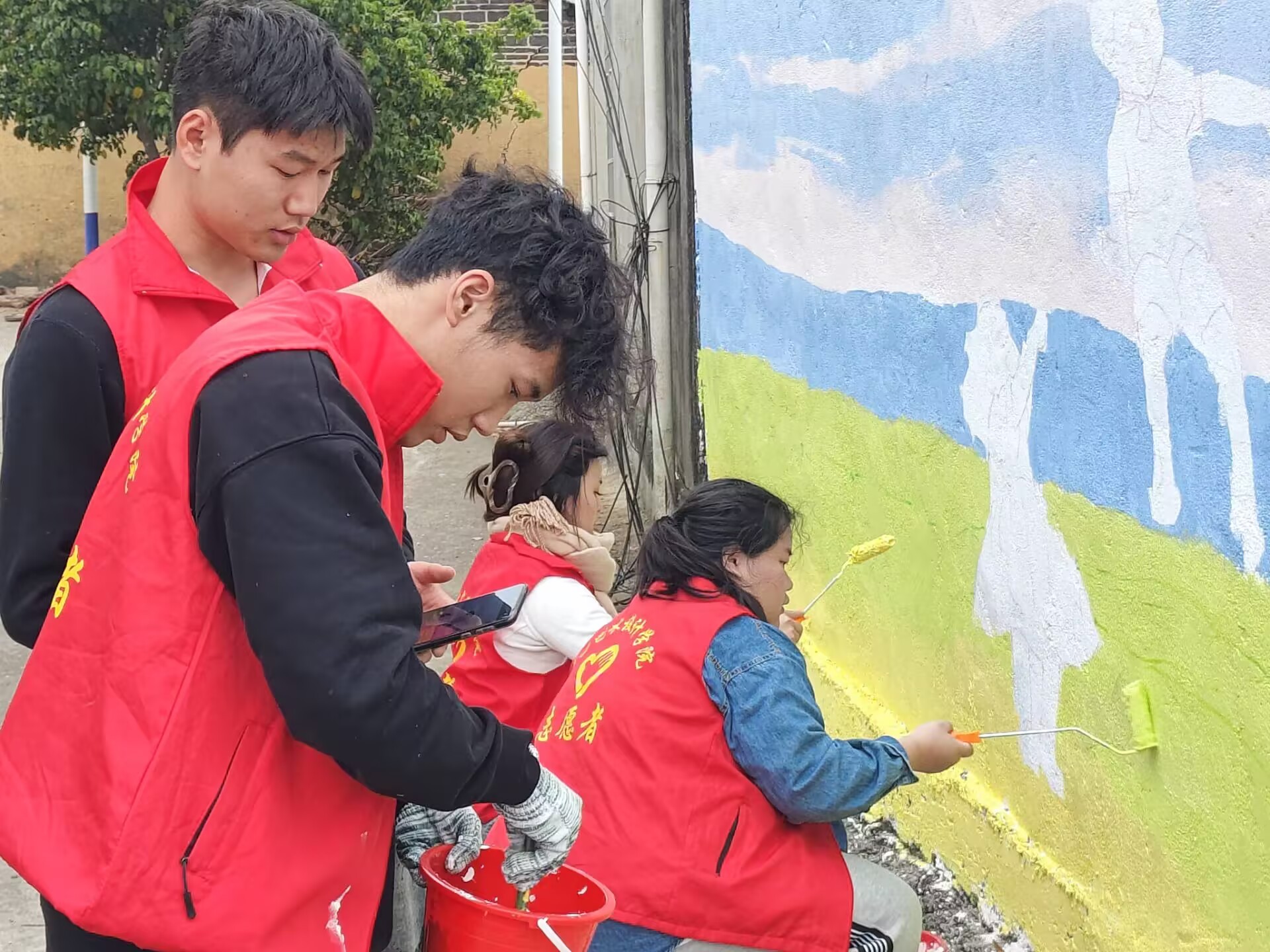 井山村小洱海墙绘学生绘制过程图