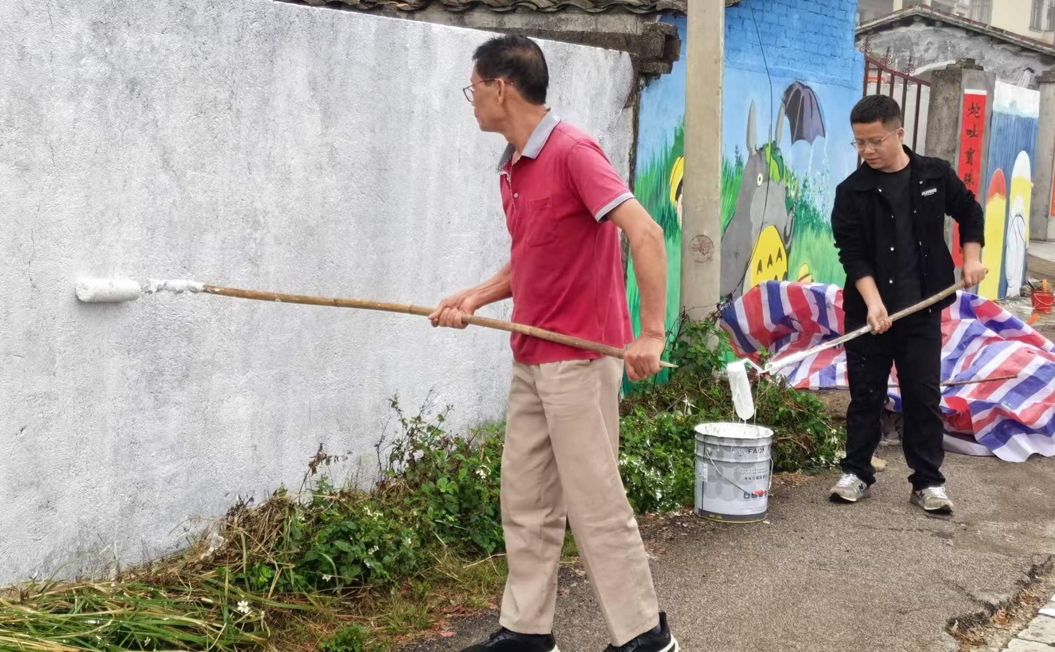 在创作中期,师生团队与村民紧密合作,共同参与到墙绘项目的每一个细节中。不仅促进了艺术与乡村文化的深度融合,还激发了村民对本土文化的认同感和自豪感。村民们纷纷表示,看到自己村庄的墙面变得如此美丽且富有文化内涵,他们感到非常骄傲和高兴。