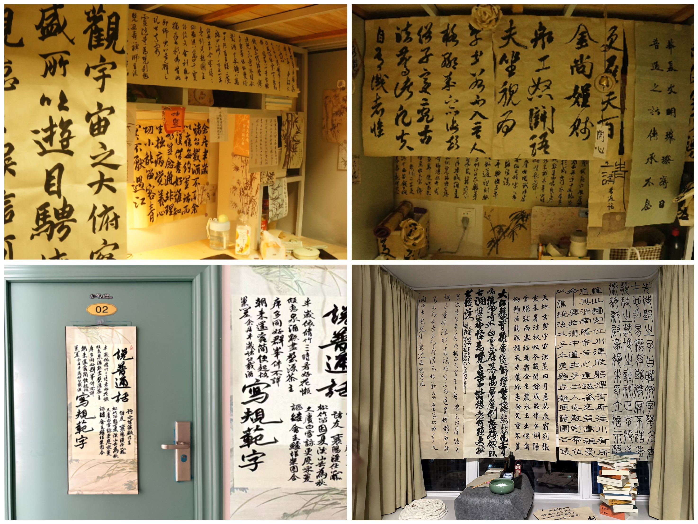 在汇报环节,各宿舍代表围绕“推普+书法”主题,分享了宿舍装饰理念、作品内涵与推普感悟。活动现场亮点纷呈:或开辟“推普书法角”,悬挂集体创作的软笔作品;或张贴手写易错字表,以朱笔标出重点;或以古朴典雅的字迹书写标语装饰门楣;或在墙面穿插推普知识卡片,将宿舍变为“规范字小课堂”。这些设计既展现了学生的专业功底,更将推普理念融入日常生活。