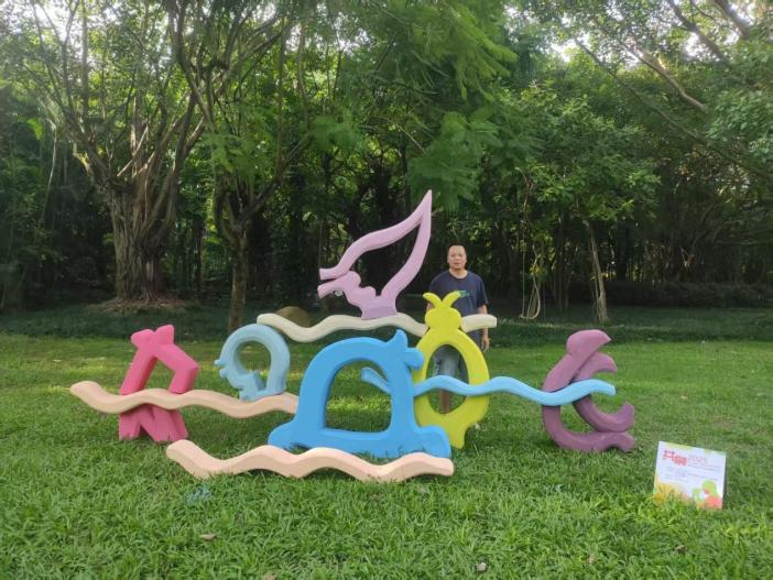 我院的作品《北部湾仲夏夜》坐落于南湖公园绿油油的草坪上,游客纷纷驻足观赏。这6种不同色彩对比、抽象构成的“鱼”形,以活泼的姿态形成了丰富而欢快的空间展示方式,点燃了广袤公园草地的空间氛围,增加公园的艺术气息与格调,给人带来了无限的想象空间与乐趣。