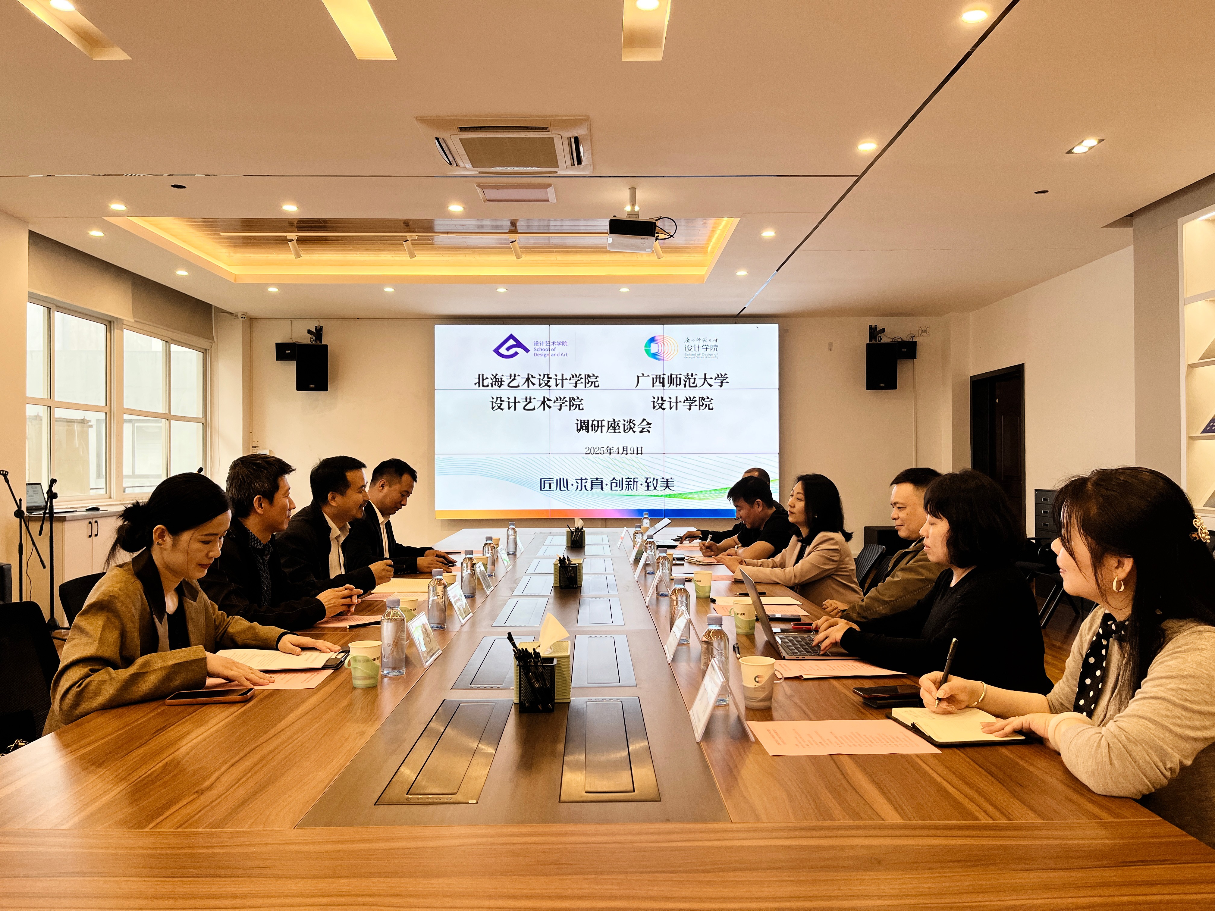 49日下午,调研首站抵达广西师范大学设计学院在该院党委书记周飞、副院长谢青等老师陪同下,调研实地参观了该院数字采集与智能输出实验室、视觉传达设计专业产品设计专业工作室等教学实践平台随后的专题交流会上,双方围绕“人工智能背景下人才培养方案修订”“数智化转型驱动课程体系升级”“AI技术在实践类课程教学中的融合应用”等议题展开研讨深入研讨人工智能技术赋能课程体系升级的实践路径该院在人才培养、课程体系优化、工作室建设及AI赋能教学等方面的成功实践,为我院人才培养方案重构提供了重要参考