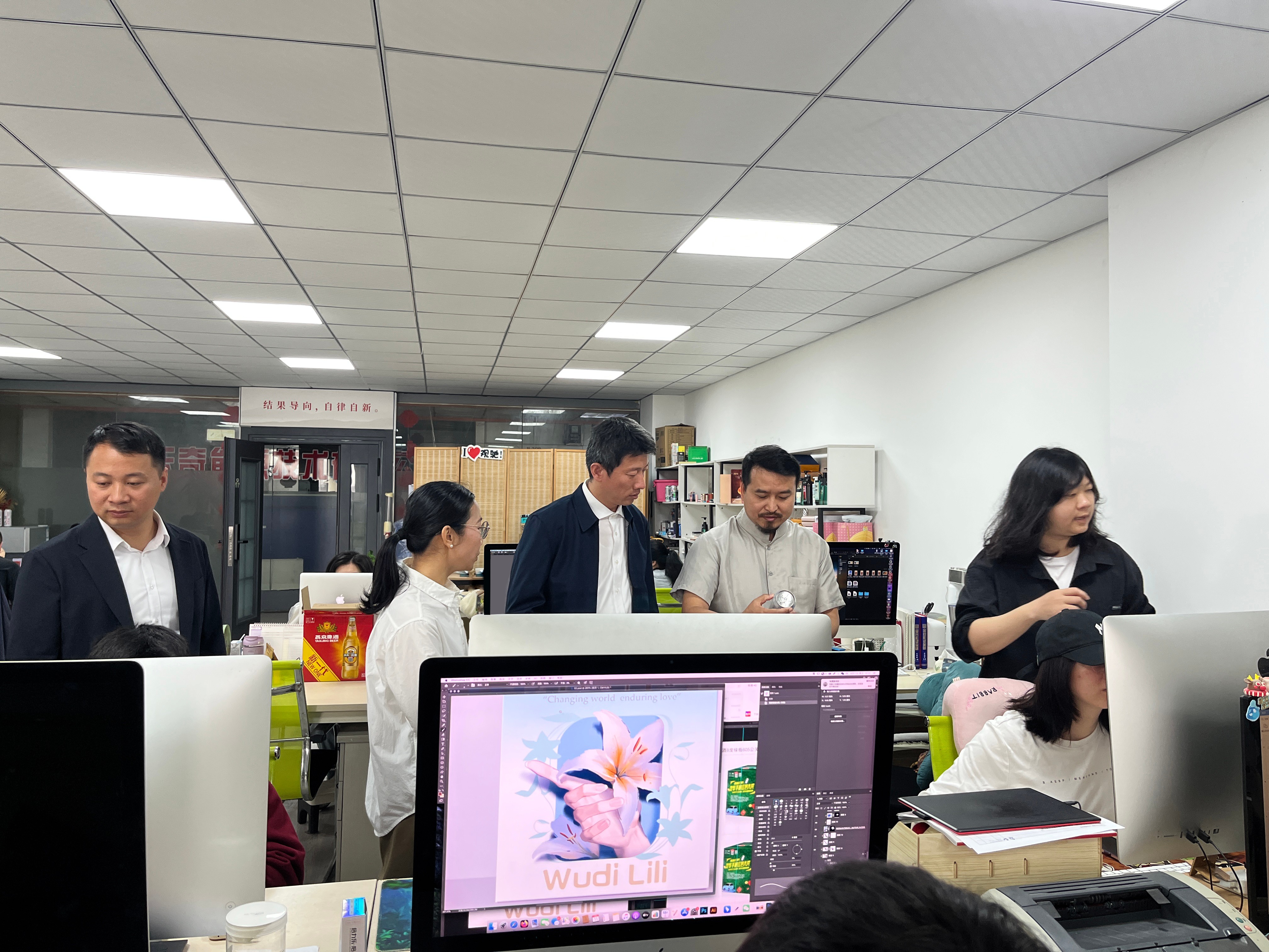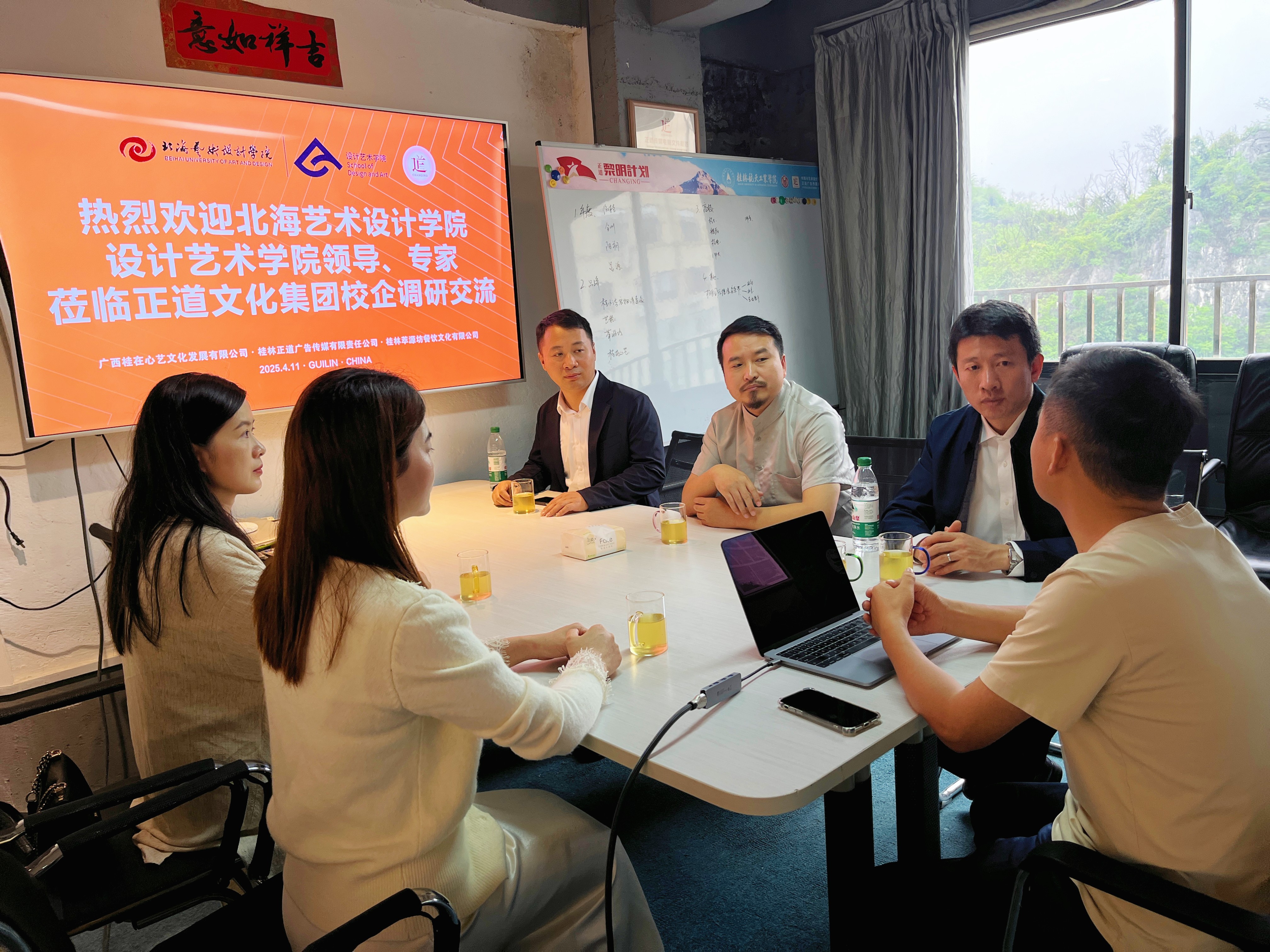随后,调研组来到桂林正道广告传媒有限责任公司,考察企业服务案例并开展交流。公司创始人刘亚东从行业视角,提出“设计+商业”双维能力培养建议,强调真实项目驱动教学的重要性,建议学院在教学中引入更多真实商业项目,帮助学生建立从创意到市场的完整思维链条,提升学生的商业敏感度和市场适应能力。本次交流为学院重构实践教学体系提供了宝贵的市场化视角,对推动设计人才培养与行业需求的无缝对接具有重要意义。