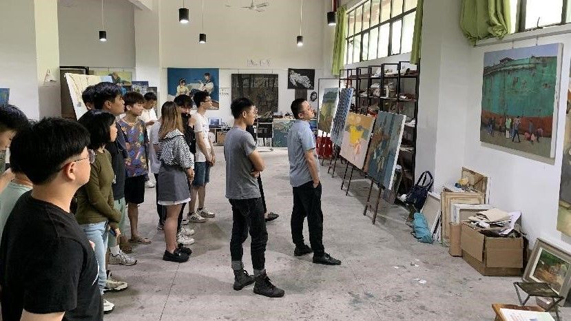 2022年6月9日,2021-2022年度第二学期末,美术学院组织绘画专业19级同学于西校区7栋教学区进行了创作课程的教学成果汇看。本次汇看评审小组由美术学院副院长龚为、美术学院综合办主任肖玺、美术学院综合办副主任陈建江、美术学院实验室主任袁志伟、绘画教研室副主任张湘中以及多位任课教师组成。各位老师对学生的作品进行了集体观摩并提出指导建议,对于即将离校的学生给予了相关事宜的嘱咐和未来学习生活上的鼓励。(张湘中 摄)