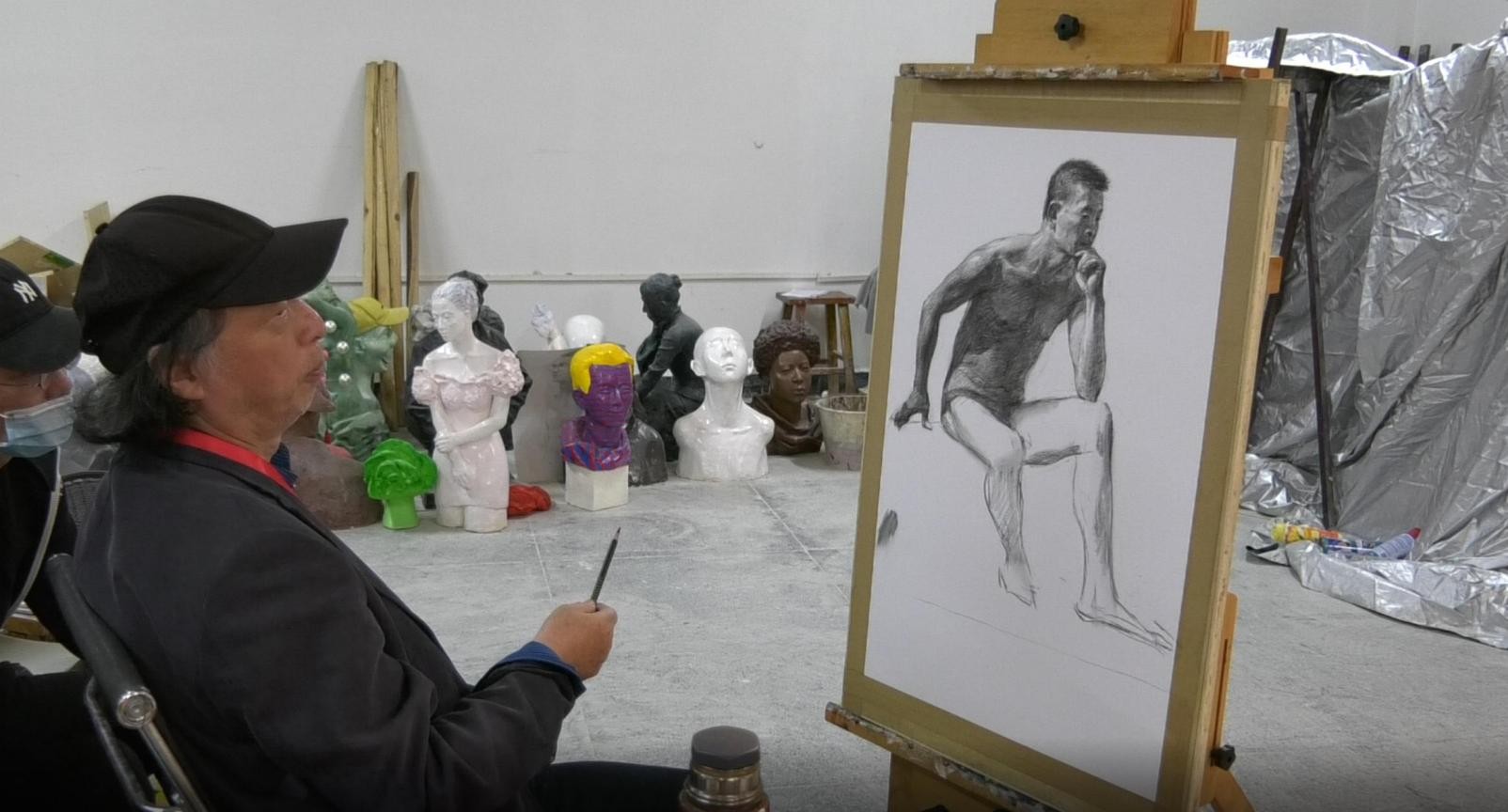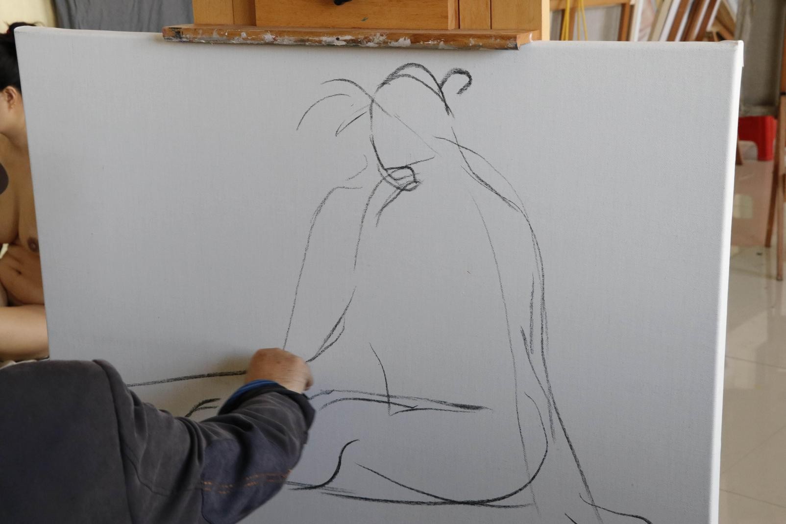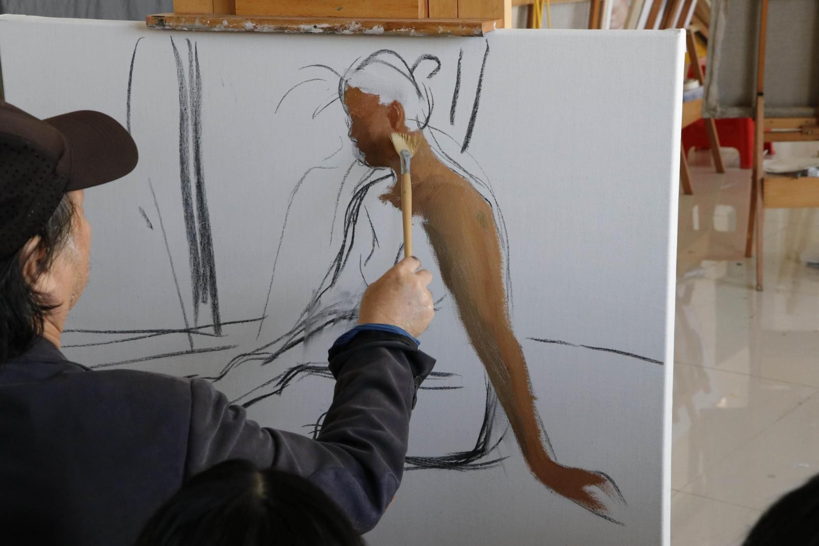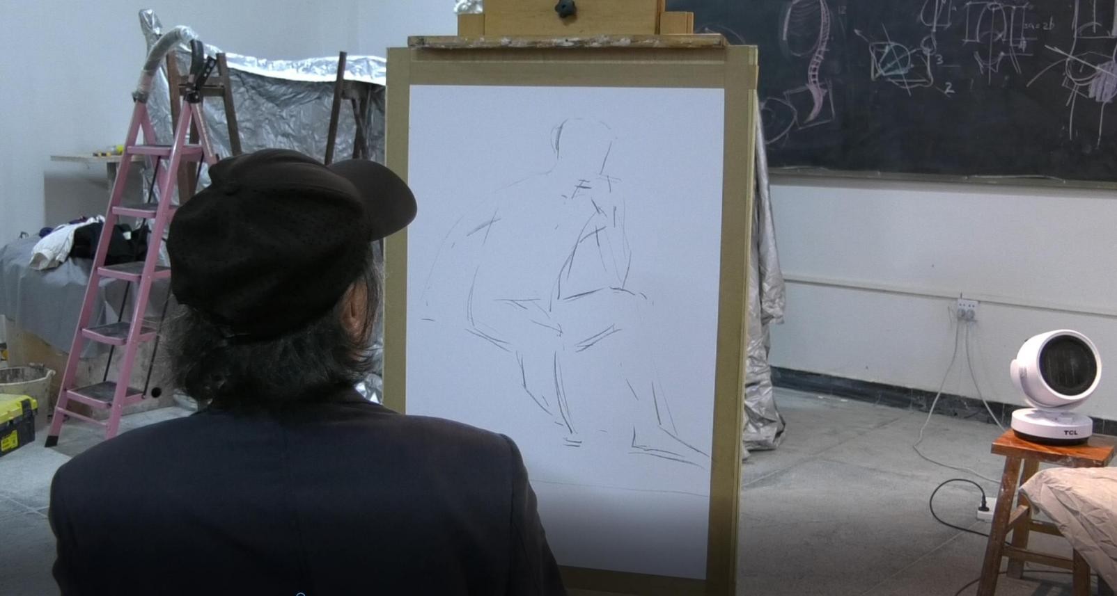 随后,曲教授开始进行示范人体写生步骤,并对创作过程进行了详细讲解。