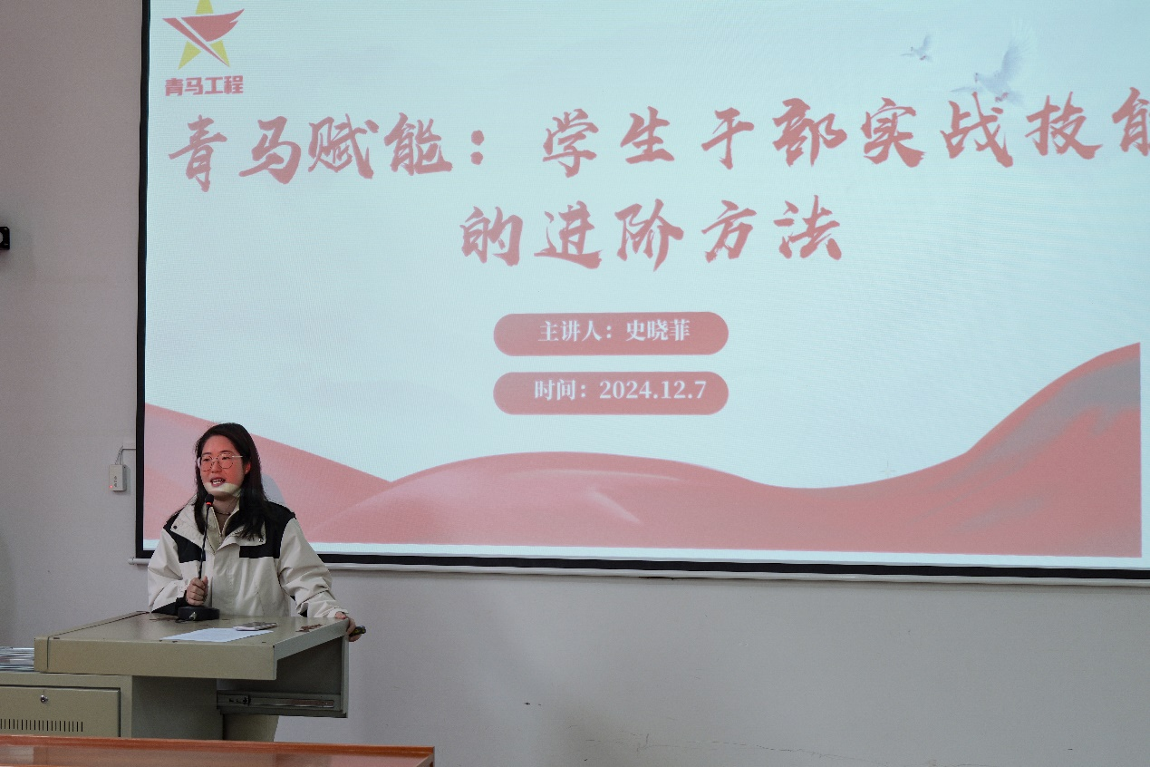 培训第一讲中,舞蹈学院史晓菲老师以《青马赋能:学生干部实战技能的进阶方法》为题,讲授了关于学生干部在日常工作中容易出现的问题及解决办法。强调对学生干部的政治训练和思想引领,提升学生干部的理论素养、实践能力和综合素质,鼓励同学们积极投身于社会实践中,将理论学习与探索实践相结合。