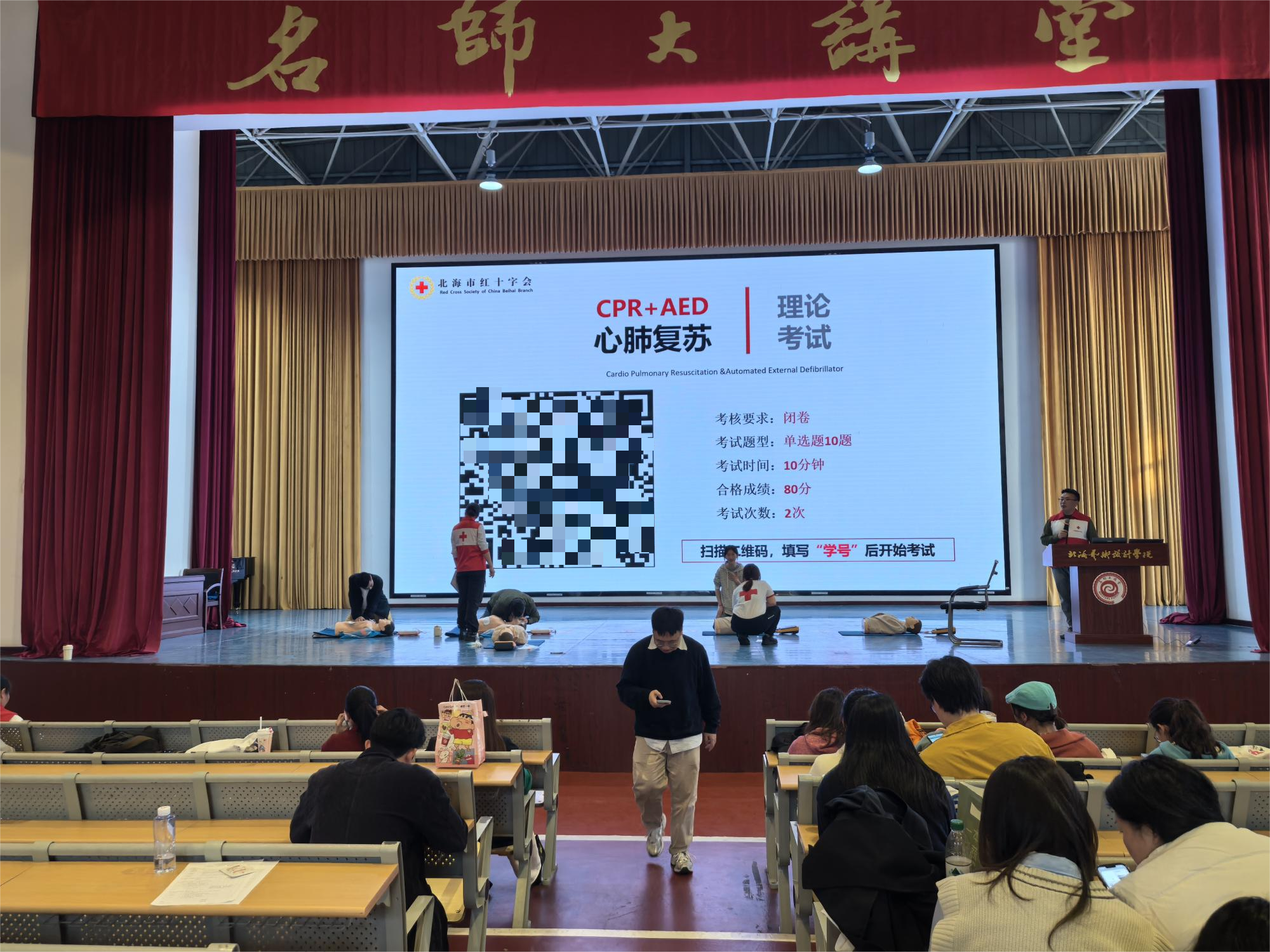 经北海市红十字会考核,参训师生共329人顺利通过理论考试和实操考核,获得中国红十字会《心肺复苏(CPR+AED)培训证书》(电子证),为应对校园突发紧急情况增添了一份保障。(周晓敏/摄)
