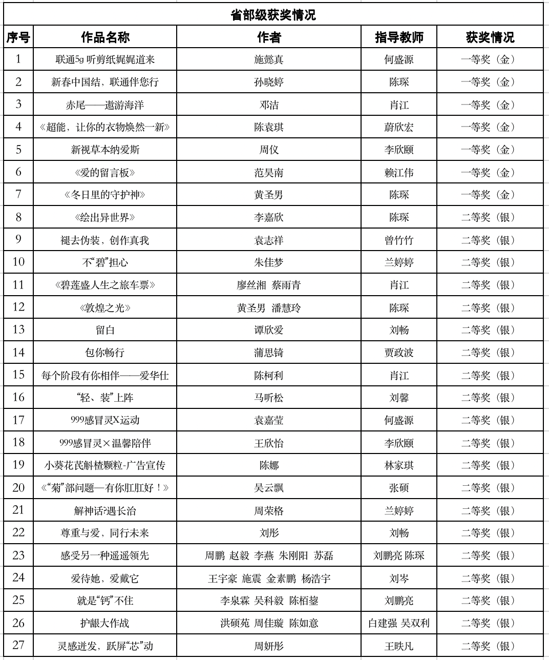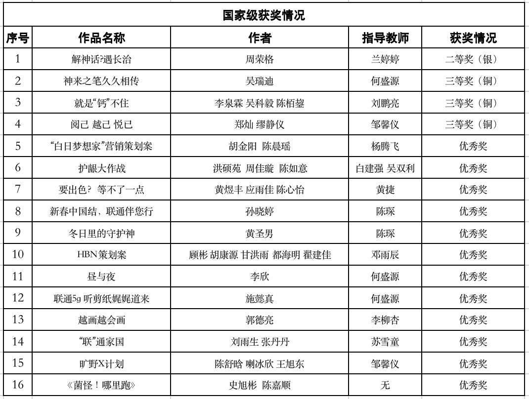 第十六届全国大学生广告艺术大赛颁奖典礼在北京顺利举行。在这场创意与智慧的激烈碰撞中,我院视觉传达专业的学子们在老师们的指导下,力克群雄,荣获国赛共16项,其中二等奖1项,三等奖3项,优秀奖12项;省赛共59项,其中一等奖7项,二等奖23项,三等奖29项,为学校再添辉煌!