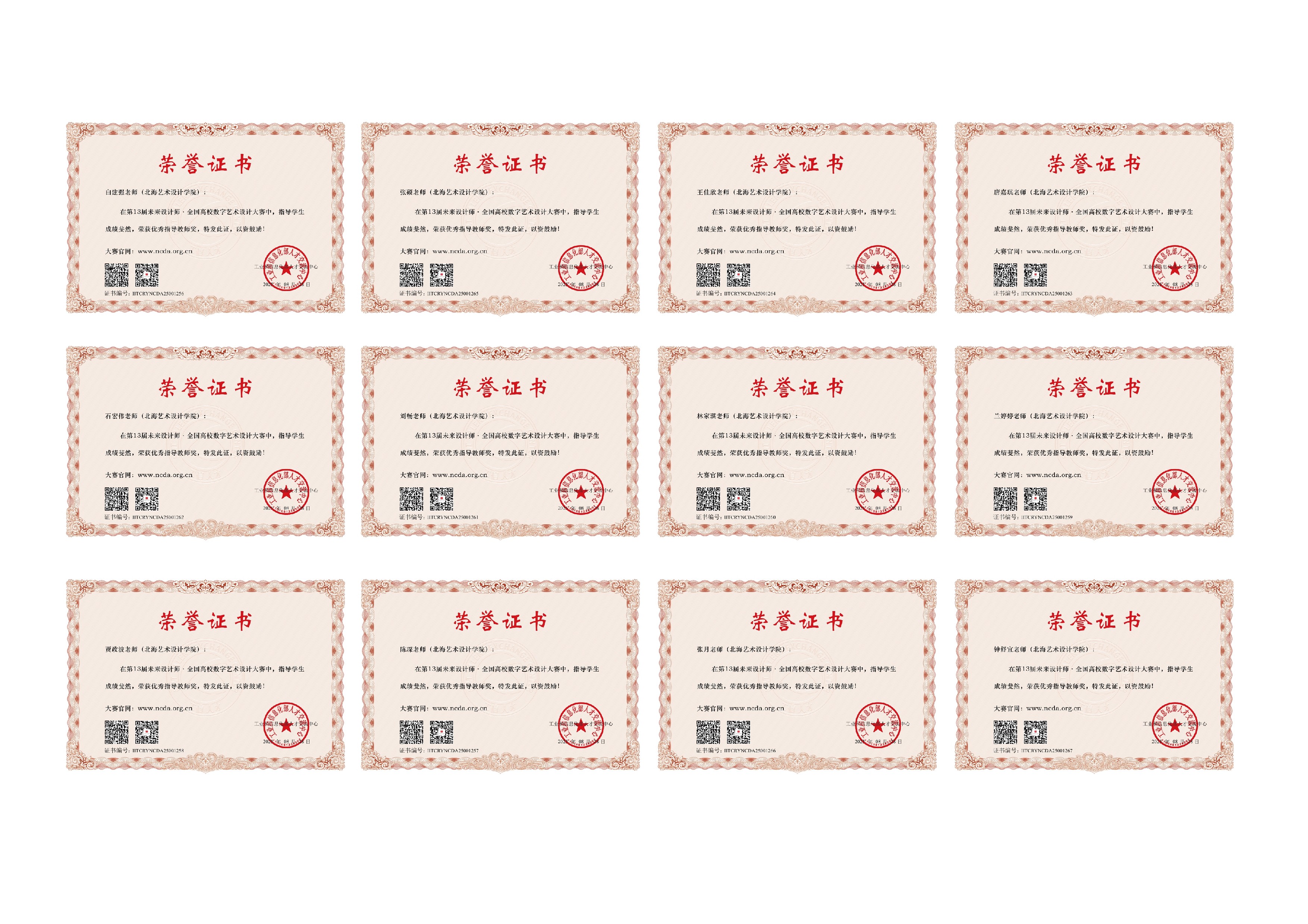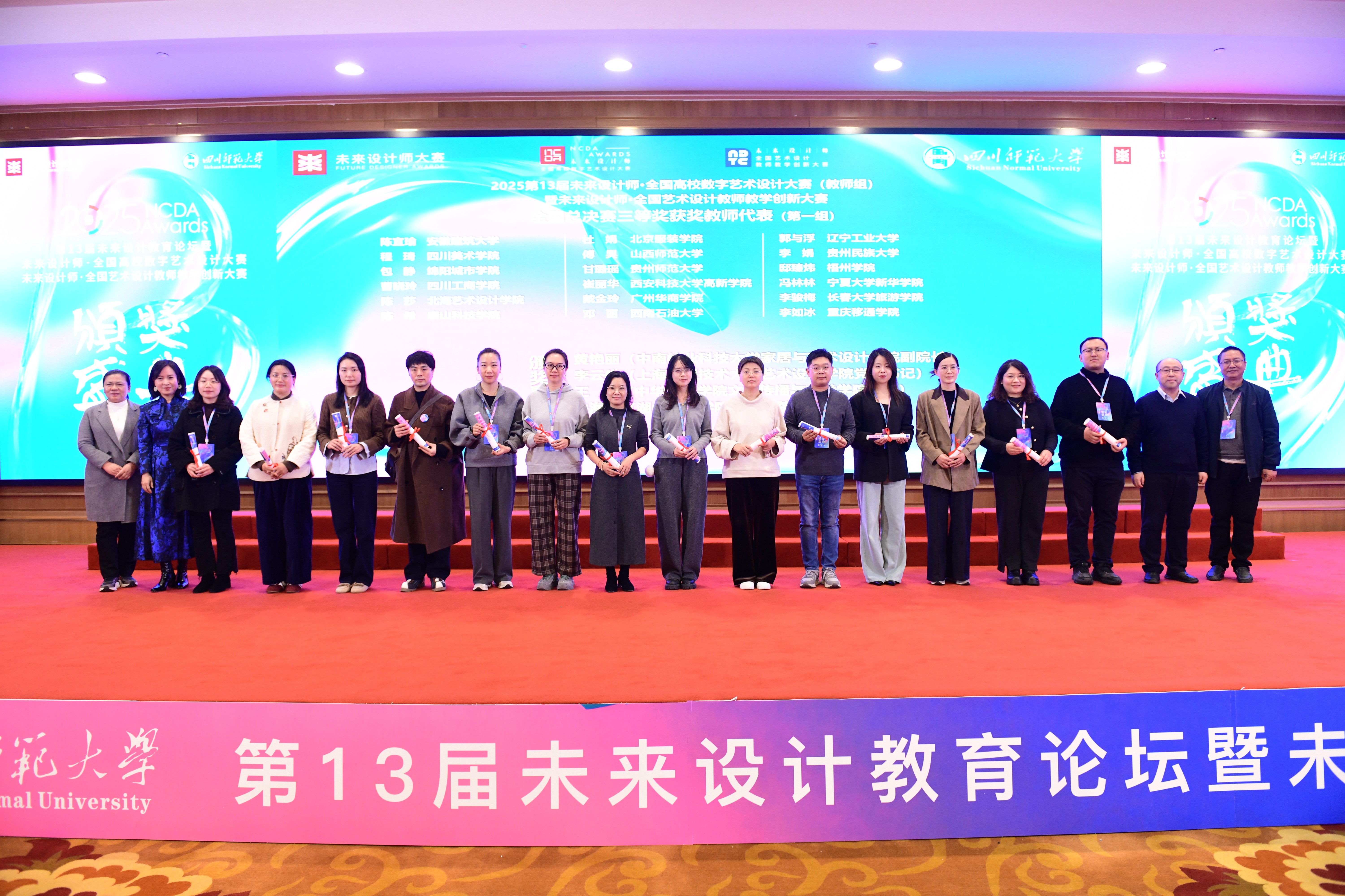 11月23日举行的第13届未来设计教育论坛暨NCDA颁奖典礼上,我院再创佳绩:师生团队共摘得全国一等奖3项、二等奖5项、三等奖4项;白建强、陈琛、贾政波等12位教师获评“优秀指导教师”;学校凭借完善的组织工作与突出的参赛成效,荣膺大赛“卓越组织奖”,全方位展现了我院在艺术设计教育与教学创新领域的综合实力。