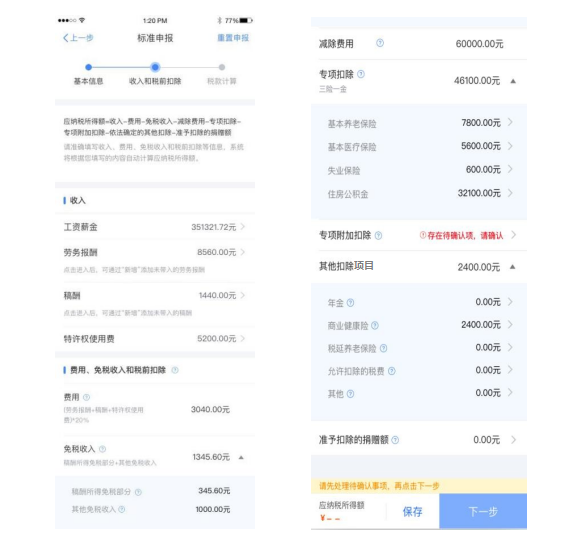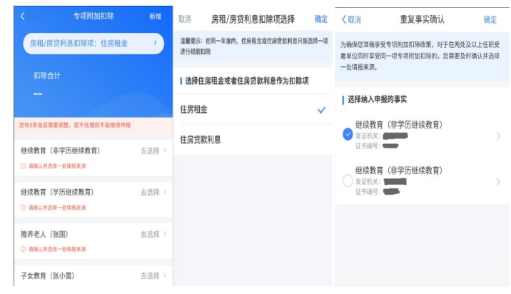若同一专项附加扣除有重复事实或同时存在住房租金 和住房贷款利息,则系统界面上将出现提示。此时,您需要对相关信息进行确认。