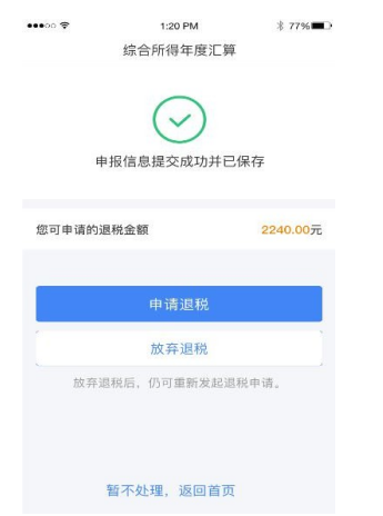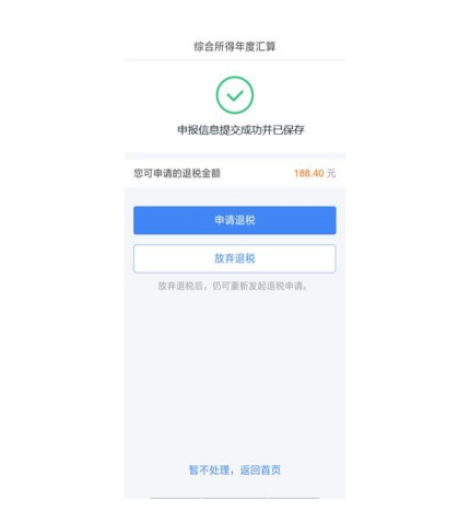 如果您的银行卡不在身边,或者暂时不想退税,可以点 击【暂不处理,返回首页】。后续可再次发起退税申请。