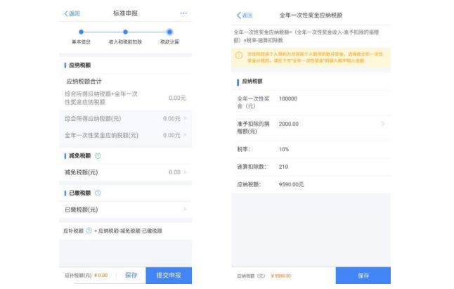您可在税款计算界面,点击【全年一次性奖金应纳税额】, 进入详情填写相应收入。若您有公益性捐赠支出,您可点击【准予扣除的捐赠额】(或在收入和税前扣除信息界面的【准 予扣除的捐赠额】)进入捐赠详情界面进行【新增】和【设 置扣除】。
