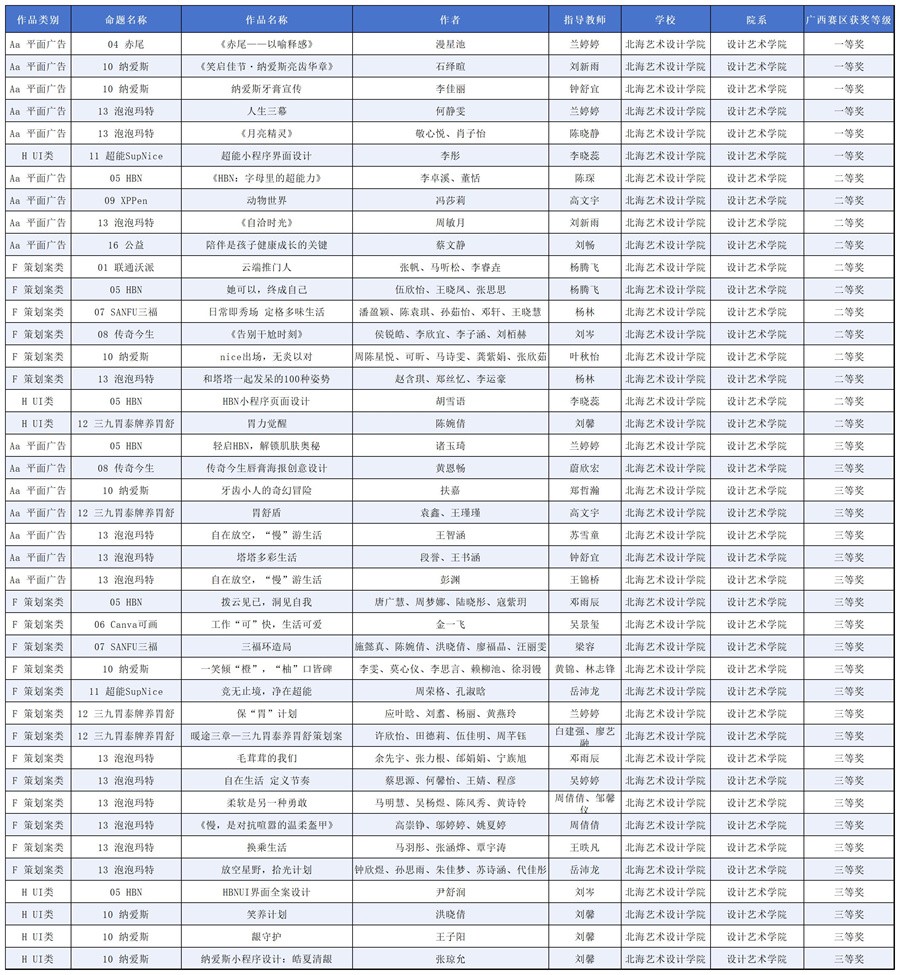 据悉,全国大学生广告艺术大赛是全国规模大、覆盖高等院校广、参与师生人数多、作品水准高的全国性高校文科竞赛,是由教育部高等教育司支持,教育部高等学校新闻传播学类专业教学指导委员会、中国高等教育学会广告教育专业委员会共同主办的全国高校设计大赛国家级A类赛事。