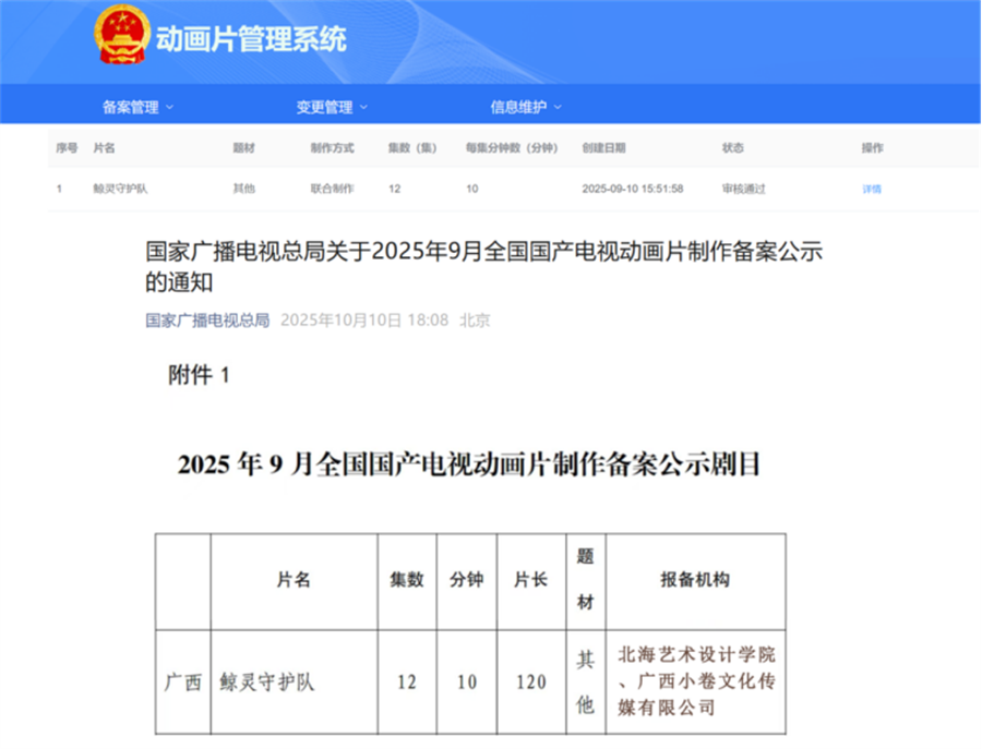 近日,国家广播电视总局发布《2025年9月全国国产电视动画片制作备案公示通知》,由我校影视动画学院与小卷工作室联合创作的电视动画系列片《鲸灵守护队》正式通过备案。这部作品作为广西北部湾地区首部以“布氏鲸”海洋生态保护为核心主题的动画,不仅标志着我校在产教融合与文化创新传播领域取得实质性突破,更成为北海打造“海洋文化名城”、构建区域文化标识体系的重要实践。