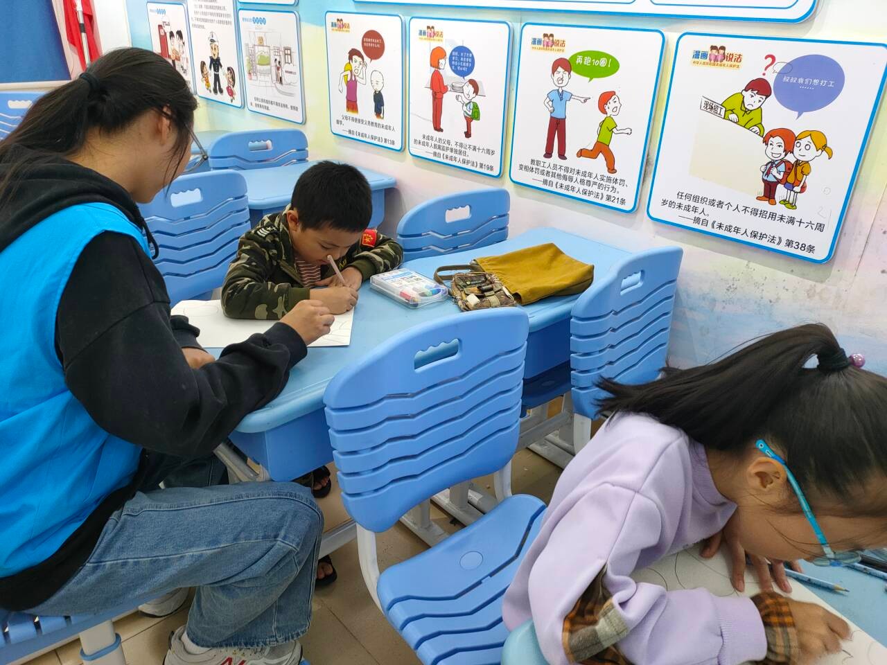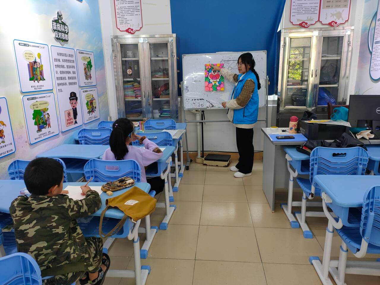 在侨北社区,志愿者们像往常一样开展绘画课程,按照准备的节奏和计划,有条不紊的进行授课。在授课过程中,氛围十分融洽,孩子们都十分乖巧,露出一双双求知若渴的大眼睛,随着志愿者们的引导和教学完成自己满意的画作。