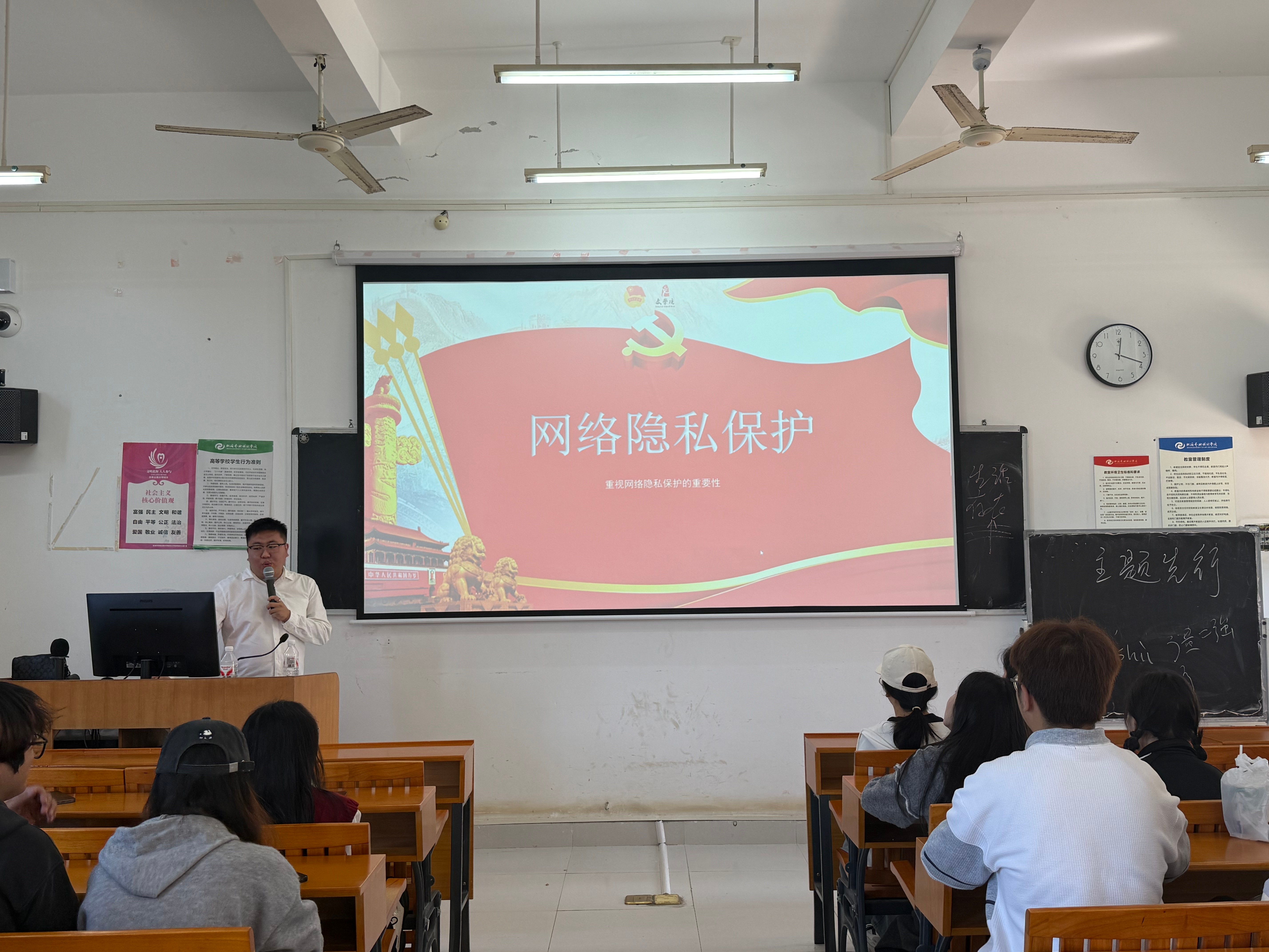 活动伊始,文学院分团委书记马有泽结合数据与案例解读互联网发展现状,强调团员青年需担起网络秩序维护责任。现场通过案例剖析、隐私保护、行为倡议等环节,引导同学们辨明信息、尊重隐私、抵制不良内容。