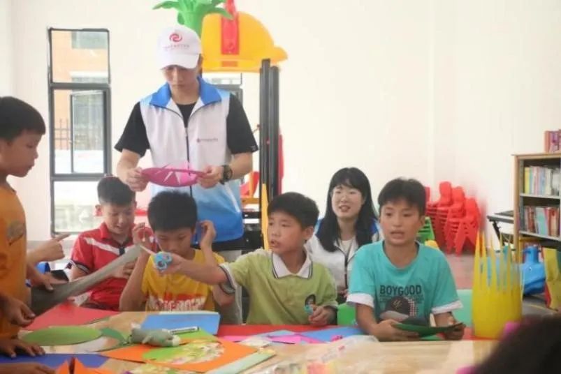 民族促进团史晓菲老师以《民族团结一家——多彩的民族》为授课题目,与当地社区五年级一班的学生一道,运用民族元素,利用涂、捏、粘、贴等方法共同了解纸浆画的制作过程。并且主动引导学生亲手将颜料,彩泥,饰品,与纸浆画相融合,通过巧妙搭配色彩、图案,制作出具有当地瑶族特色的民族饰品。