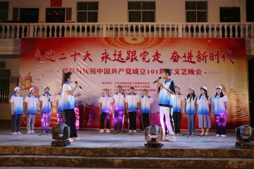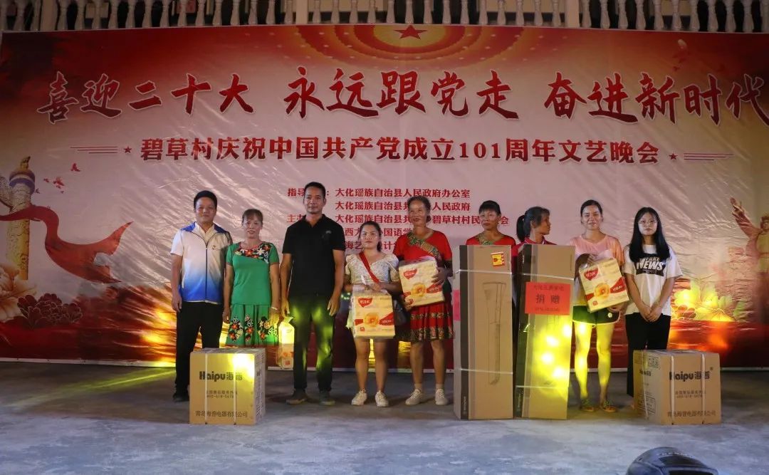 13日晚上,当地政府部门,村民,我校民族团结促进团师生成员与当定政府部门、村民及广西大学志愿者一起联合碧草村群众开展了庆祝中国共产党成立101周年文艺晚会,并代表学校向当地人民群众送去了支持与祝福。